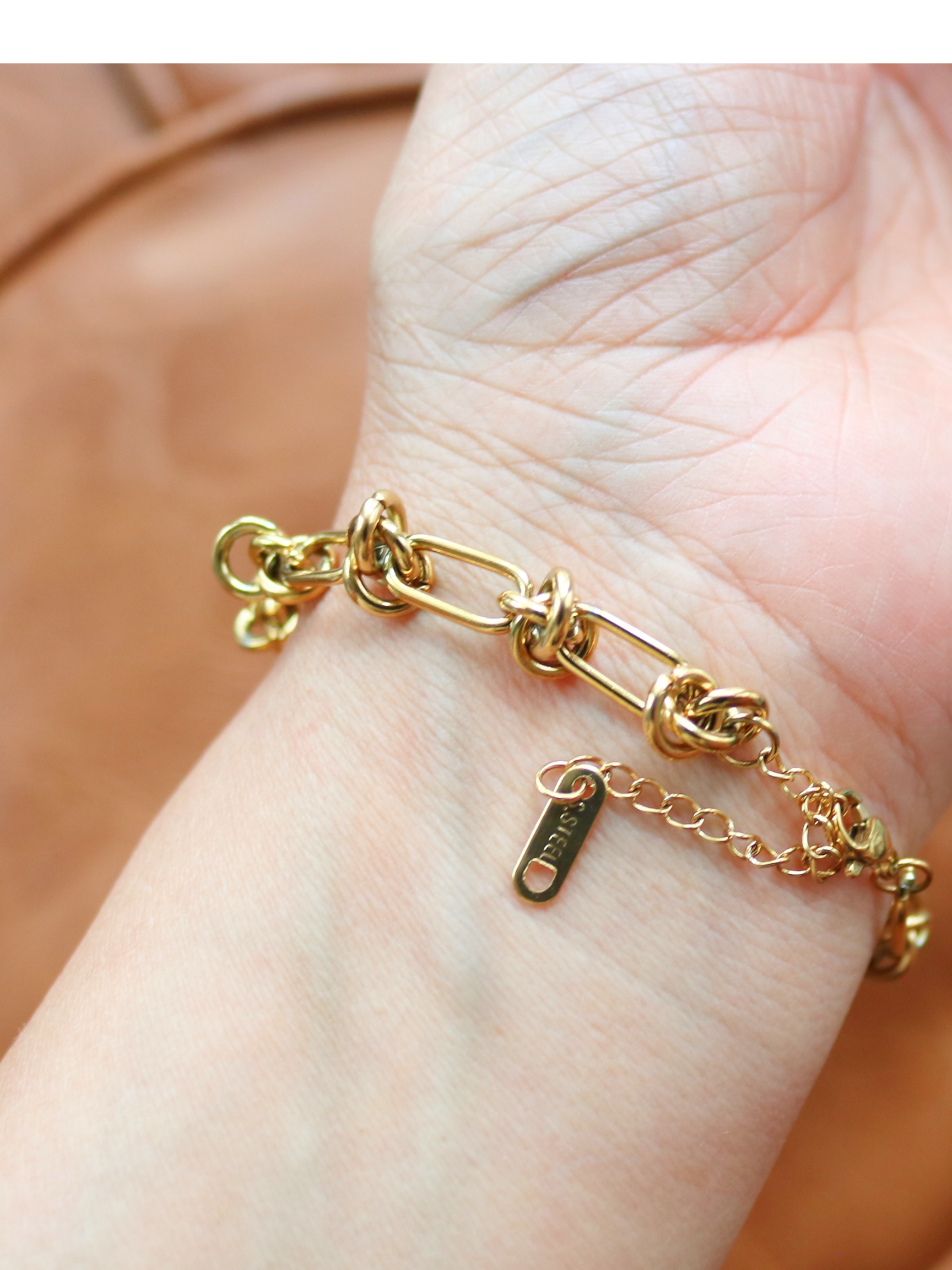 Crafted for sophistication and durability, this stunning bracelet features a sleek, modern knot design plated in rich 18k gold. Made from high-quality stainless steel.